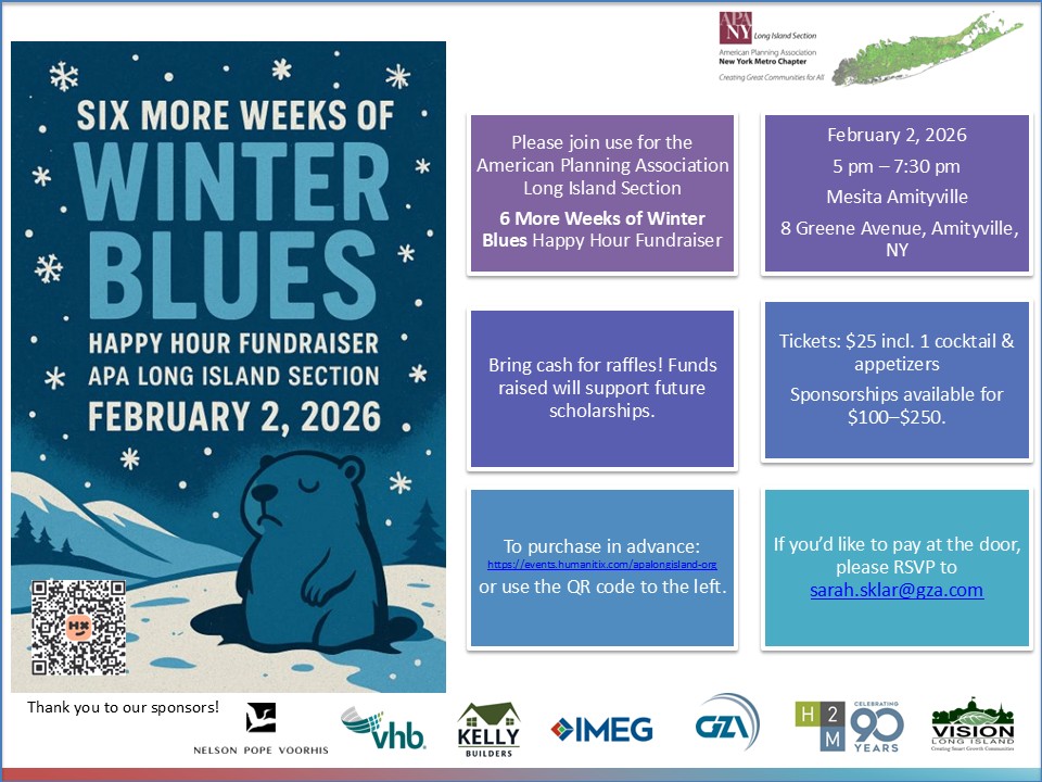Please join the APA Long Island Section on February 2, 2026 for what (we hope) will be an annual happy hour and fundraiser to help chase away the “winter blues”!