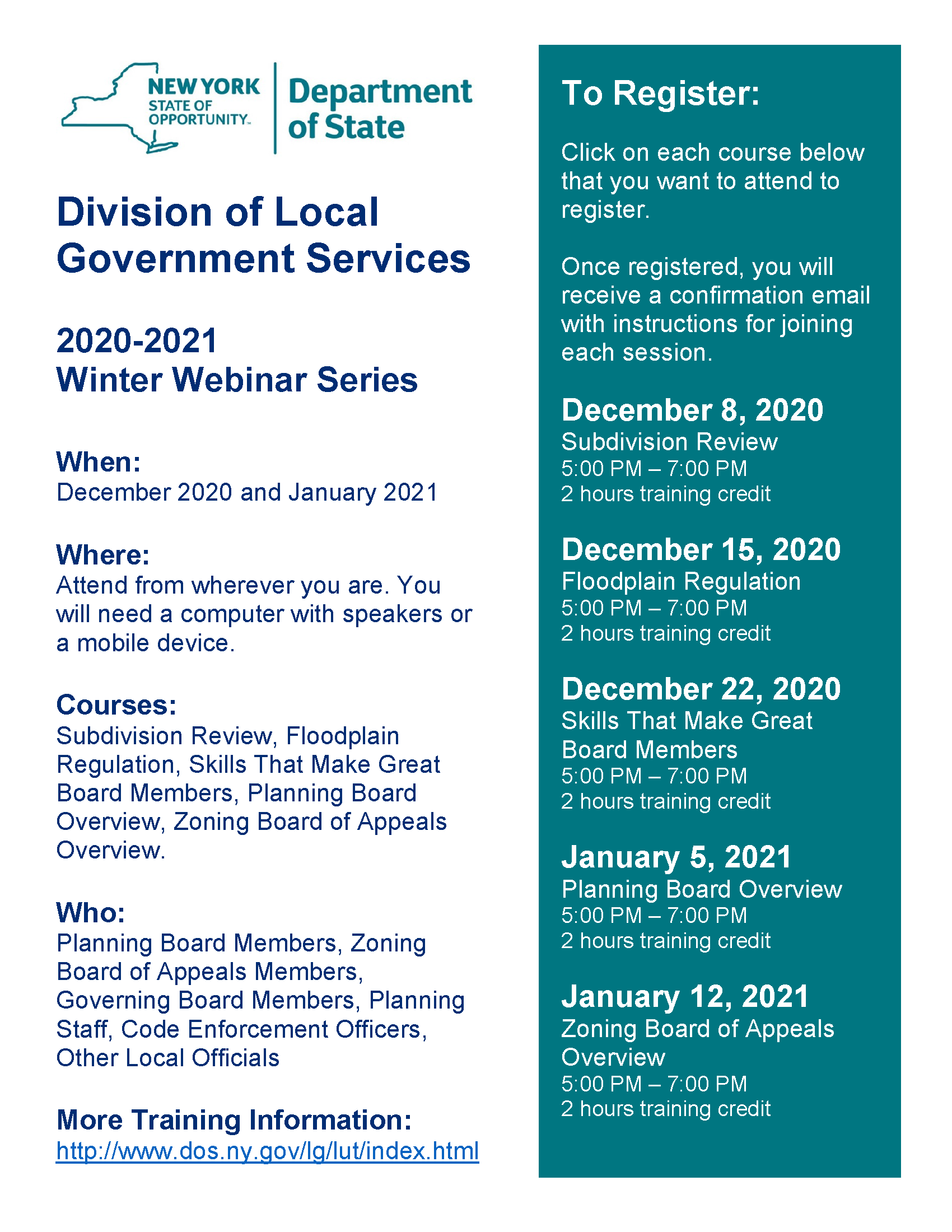 For planning and zoning board members, two courses from this webinar series will fulfill the four hour annual training requirement from New York State.