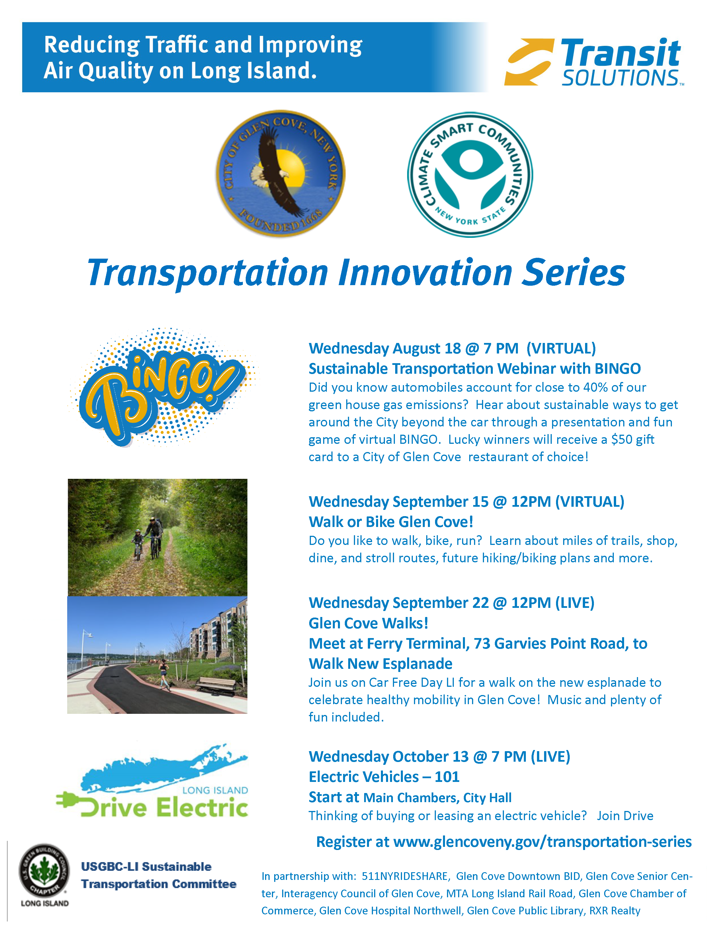 The City of Glen Cove is hosting a Transportation Innovation Series, with several events planned over the next several weeks. Please see the Innovation Series flyer for more information. Link to register available HERE.