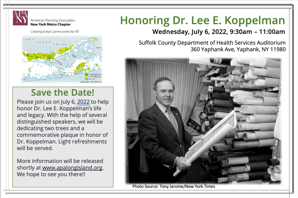 Please note that the event will start at the Suffolk County Department of Health Services Auditorium (360 Yaphank Avenue, Yaphank NY 11980). We will then take a short walk over to the Suffolk County Farm and Education Center for the dedication ceremony. We hope to see you there!