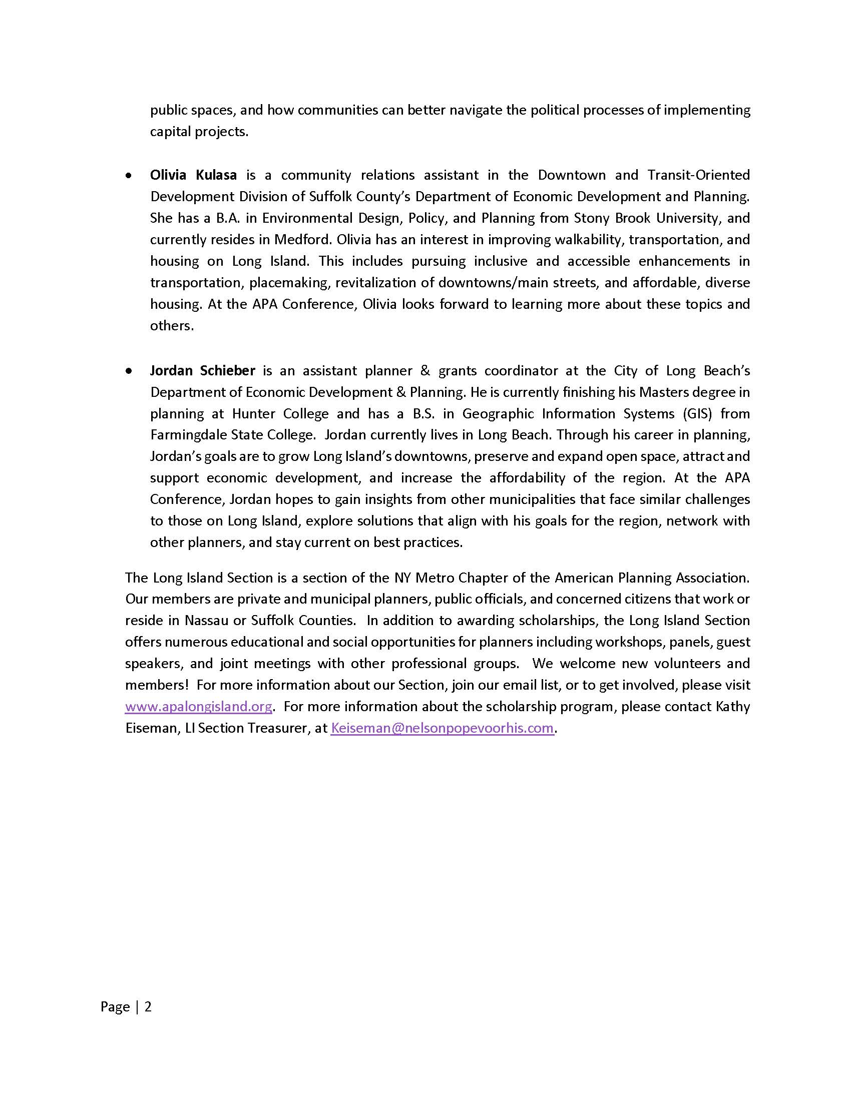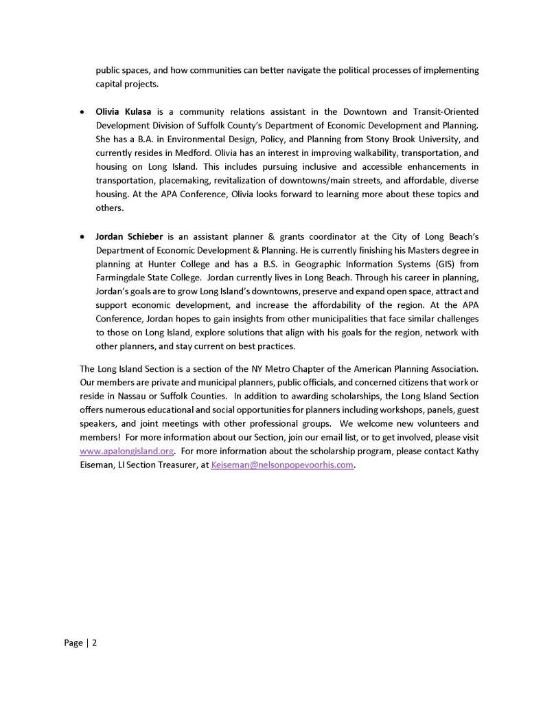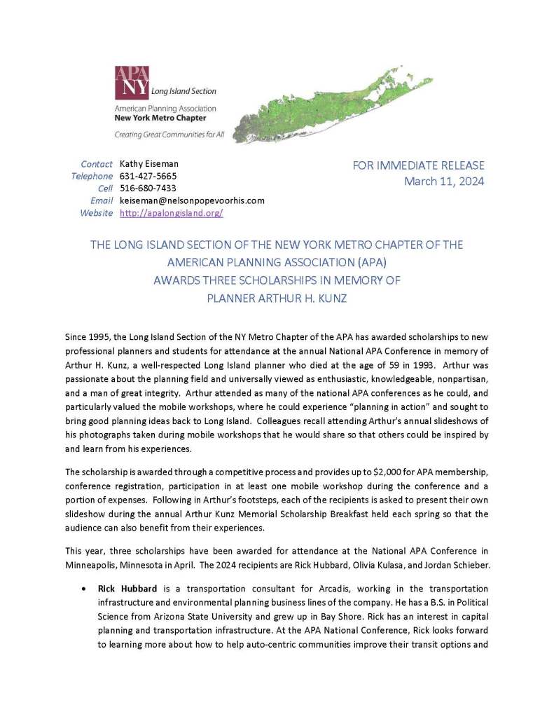 The APA Long Island Section is pleased to announce the recipients of the Arthur Kunz Memorial Scholarship for 2024. Congratulations to this year’s recipients!
