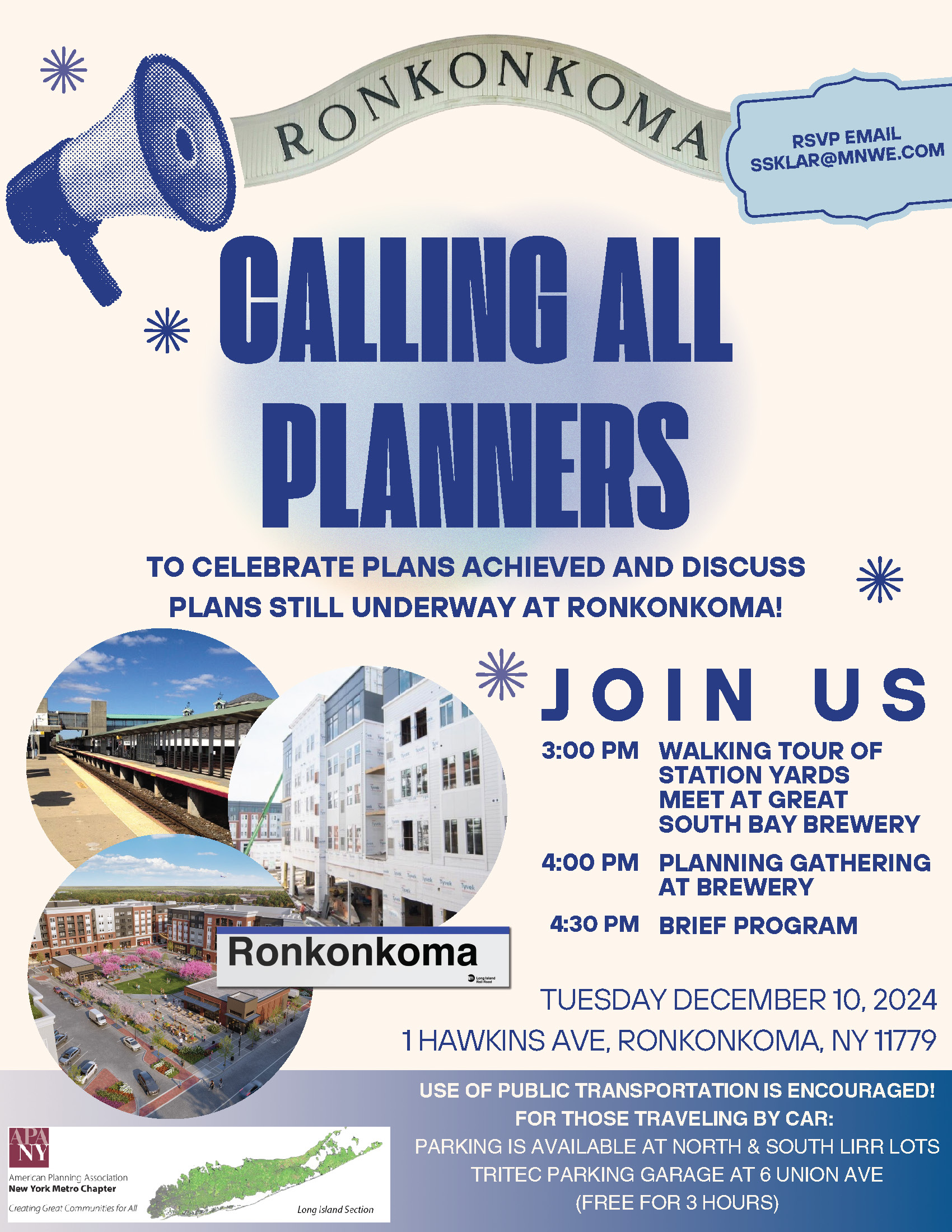 Please join the APA Long Island Section for a walking tour of Station Yards on December 10th at 3 pm! A happy hour will follow at Great South Bay Brewery at 4 pm and will include a brief program to discuss plans achieved and plans underway at Ronkonkoma. Please RSVP by December 9th. We look forward to seeing you there!