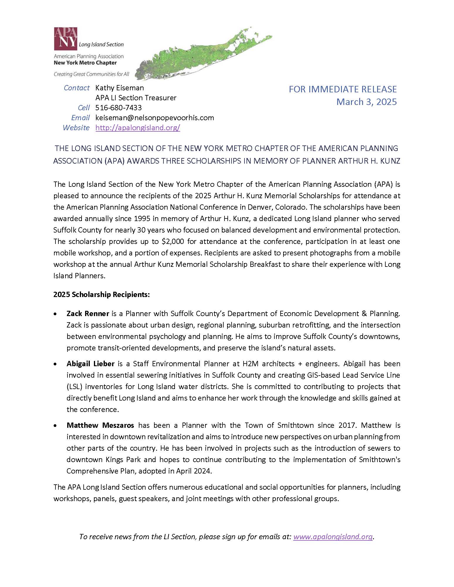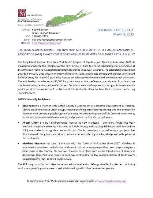 The APA Long Island Section is pleased to announce the recipients of the Arthur Kunz Memorial Scholarship for 2025. Congratulations to this year’s recipients!