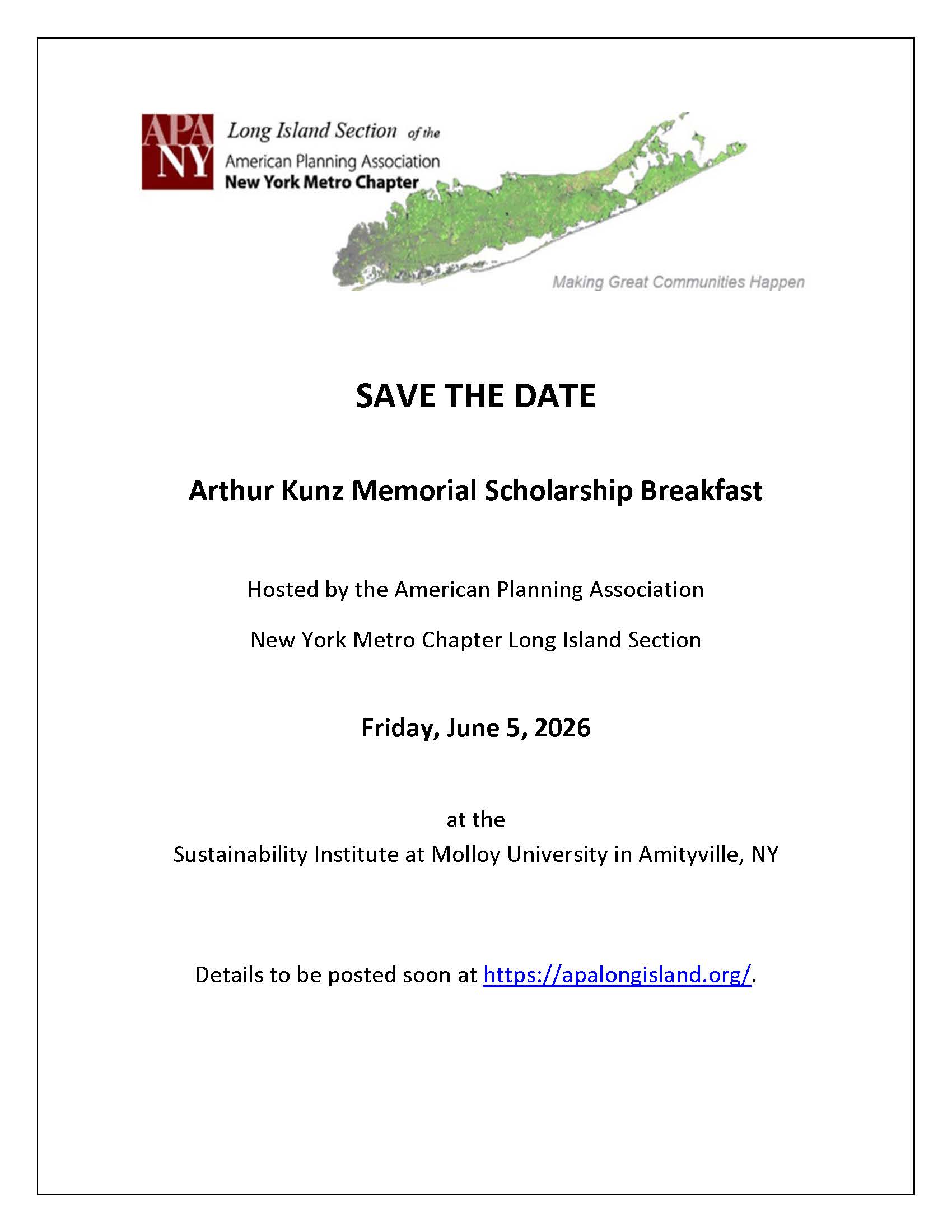 Save the Date! Our annual Arthur Kunz Memorial Scholarship Breakfast will be held on June 5, 2026, at the Sustainability Institute at Molloy University in Amityville.