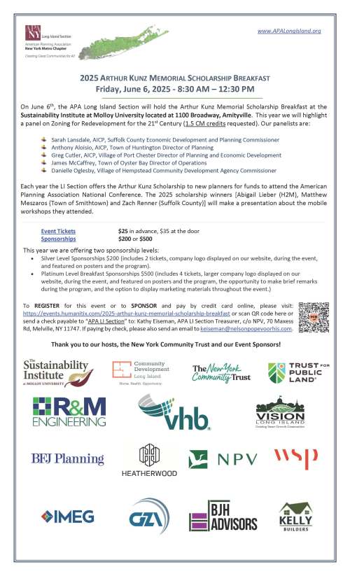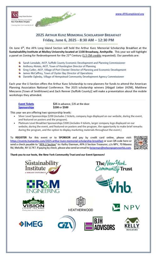 Thank you to all who attended the 2025 Arthur Kunz Memorial Scholarship Breakfast! A special thank you to Sustainability Institute at Molloy University, to our opening speakers (Dave Tepper and Anthony Aloisio) and our Zoning for Redevelopment panelists (Sarah Lansdale, Anthony Aloisio, Greg Cutler, James McCaffrey and Danielle Oglesby). Congratulations again to our 2025 scholarship recipients: Zack Renner, Matthew Meszaros and Abigail Lieber!