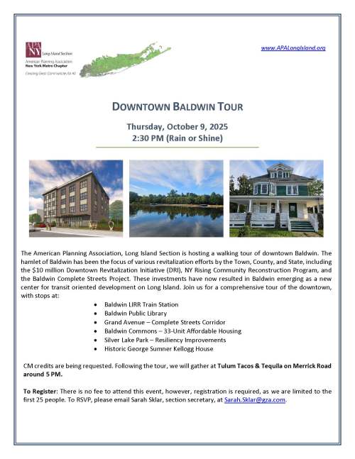 Please join the APA Long Island Section for a walking tour of downtown Baldwin on Thursday, October 9th at 2:30 PM. A happy hour will follow at Tulum Tacos & Tequila at around 5 PM. We hope to see you there!